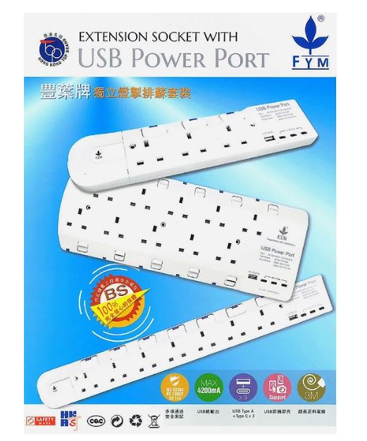 【貨品名稱】豐葉牌 FYM S344USBCA 獨立LED開關+1TypeA+3TypeC 拖板- 13A X 4位